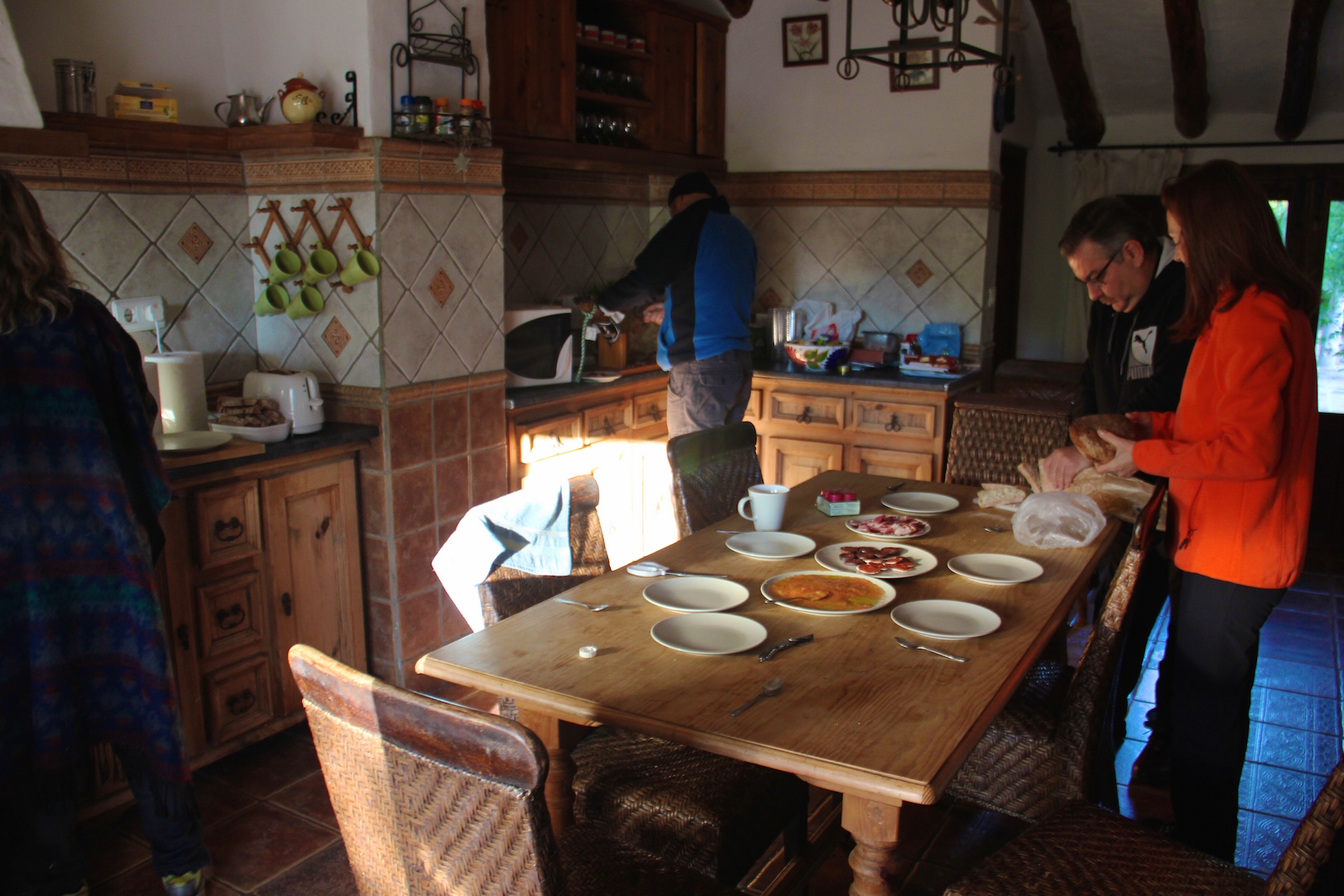 La cocina con una buena mesa era el punto de reunión dentro de la casa, allí hemos hecho unos desayunos fabulosos, donde han caído todo tipo de viandas, desde el lote completo ( una paletilla de jamón, chorizos, salchichón, morcillas) a otras que llevamos en incluso un buen lote de churros que Antonio nos trajo una mañana del pueblo. Así como también las cenas.