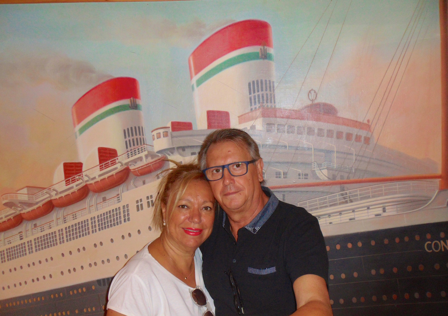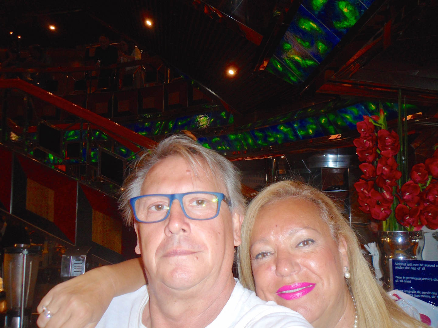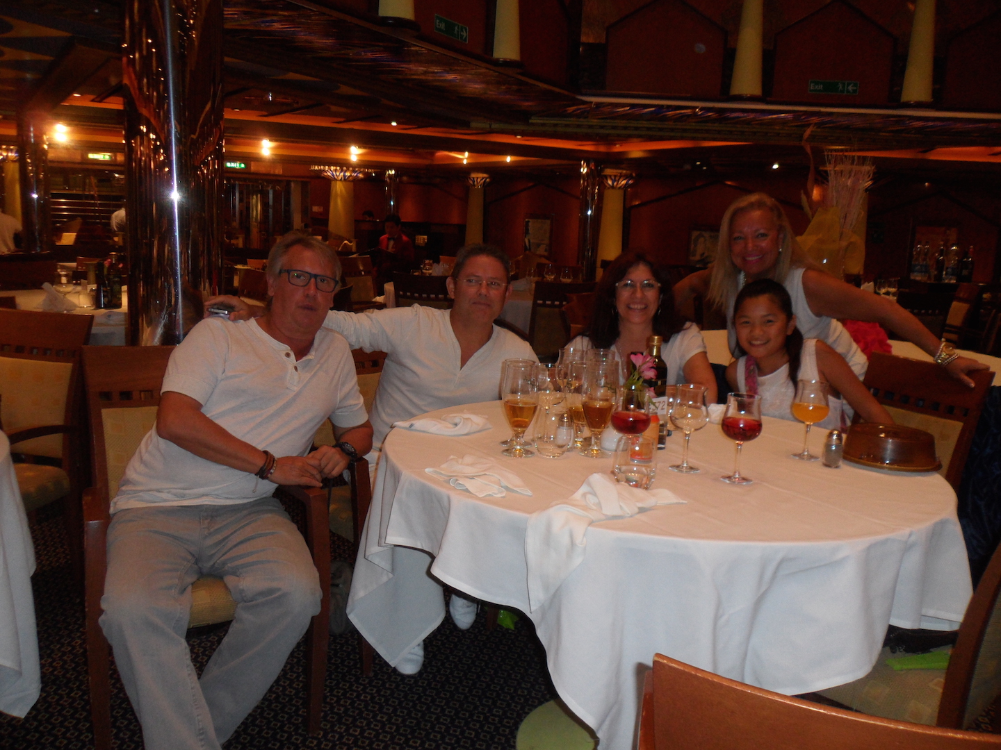 Como es costumbre en los cruceros te asignan hora y mesa para cada noche en la cena. Compartimos mesa cada día con unas maravillosas personas Vicente, Micaela y su hija Esther. Fue una compañía estupenda durante todo el crucero y en casi todas las ciudades que visitamos, así como en la copa que cada noche compartíamos después de cenar en la discoteca del barco o en algunos de sus bares de cocteles ambientados con música en directo.